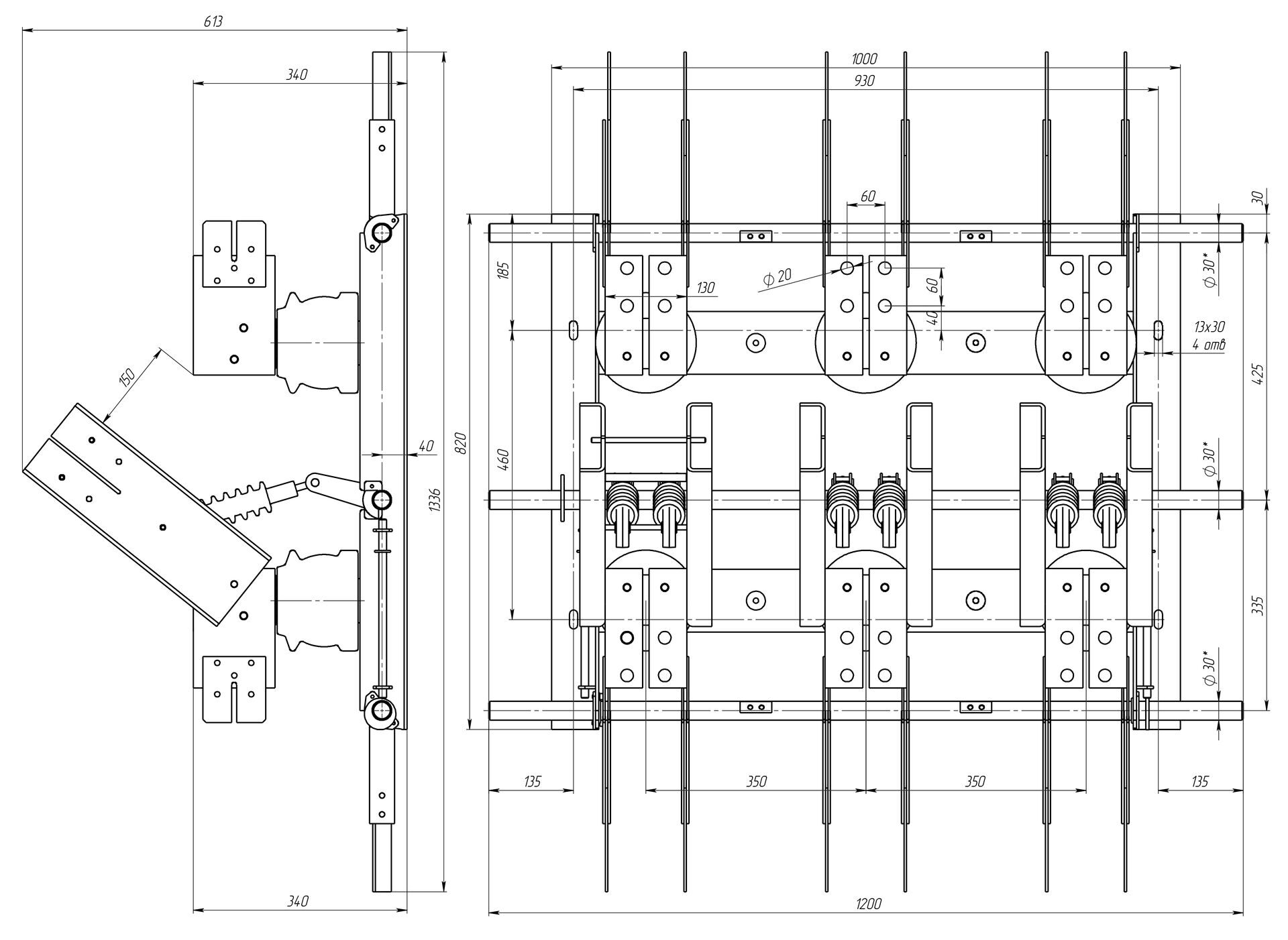 Разъединитель трехполюсный, заземляющие ножи со стороны подвижного контакта.
